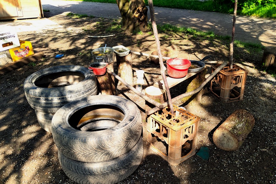 Das Außengelände des Kindergartens ist optimal auf die jeweiligen Bedürfnisse der Kinder ausgerichtet. Unser Niedrigseilgarten bietet den Kindern die Möglichkeit verschiedene Bewegungs- und Körperkoordinationsübungen auszuprobieren. Außerdem stehen den Kindern zwei Schaukeln, ein Sandkasten mit Wasserpumpe und Matschbereich zur Verfügung. Des Weiteren stehen den Kindern diverse Fahrzeuge, wie Lauf- und Dreirad wie Roller, zur Verfügung. Ein selbstgebauter Pizzaofen ist eine große Besonderheit auf unserem Außengelände. Mehrere Hochbeete laden die Kinder dazu ein, verschiedene Kräuter und Obst- und Gemüsesorten selbstständig zu säen, zu ernten und den Ertrag zu verarbeiten oder gleich zu genießen. Zusätzlich steht uns der angrenzende Pausenhof der Grundschule für viele Bewegungsanlasse zur Verfügung.