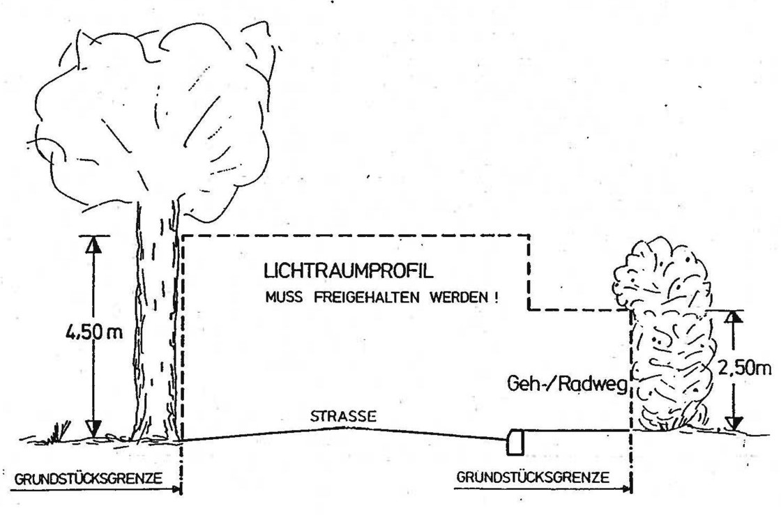 Nach dem Straßengesetz für Baden-Württemberg sind die Eigentümer und Bewirtschafter von Grundstücken, die an öffentliche Straßen oder sonstige Verkehrsflächen angrenzen und im Bereich der Grundstücksgrenzen zu diesen Verkehrsflächen Bäume, Sträucher oder Hecken gepflanzt haben, verpflichtet, diese derart zurückzuschneiden, dass sie nicht über die Grundstücksgrenze hinausragen. Ist dies dennoch der Fall, sind sogenannte Lichtraumprofile, wie sie nachfolgend angegeben und in der nachfolgenden Abbildung dargestellt werden, strikt einzuhalten: