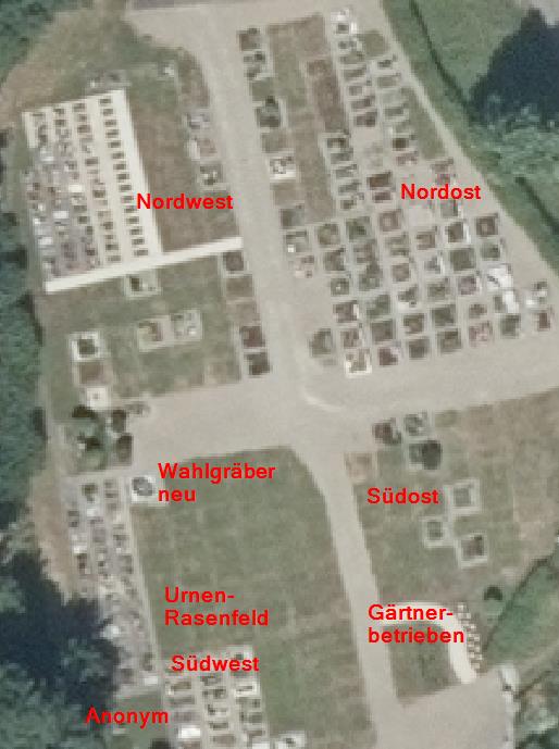 Das Grabfeld für die neuen Reihen- und Wahlgräber befindet sich im Südwesten. Vorhandene Reihen- und Wahlgräber befinden sich im Nordosten. - Auch im neuen gärtnerbetriebenen Grabfeld ist eine Beisetzung in Form eines Erdgrabes als Reihen- oder Wahlgrab möglich.
