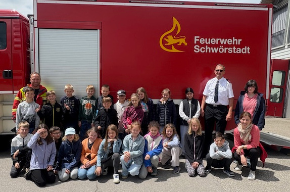 Am 16. Mai 2025 war die vierte Klasse der Schule am Heidenstein bei der Feuerwehr in Schwörstadt zu Besuch. Feuerwehrkamerad Frank Lückfeldt war zuvor in die Schule gekommen, um den Schülern das Logo der Feuerwehr zu erklären und die Fragen der Kinder zu beantworten. Danach nahm er die vierte Klasse mit zum Feuerwehrhaus.